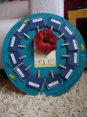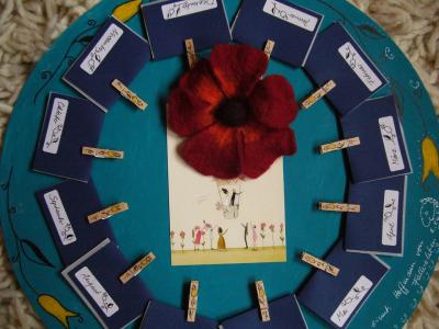 Hier ein Photo des Hochzeitskalenders, den ich, wie bereits erwähnt, vor einiger Zeit für ein liebes Brautpaar gemacht habe. Alle Gäste, die sich bereit erklärten, eine Aufgabe für einen Monat des 1. Ehejahres zu übernehmen, erhielten auch eine rote Filzblume. (Am Anfang waren noch 12 rote Filzblumen am Kalender.)