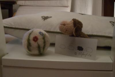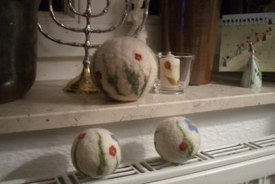 Die weißen Filzbälle haben jetzt noch große und kleine Geschwister in Blau bekommen. Die Bälle sind komplett aus Wolle gefilzt, haben z.T. ein klapperndes Innenleben und erfüllen den Zweck der Dekoration (keine eingefilzte Seife, was ist eingefilzte Seife?)